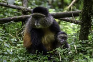 Other wildlife within Volcanoes National Park includes blue monkey, black-fronted duiker, bushbuck, giant forest hog, African civet, genet, and buffalo. Golden monkeys, a rare, playful subspecies of blue-monkeys, are also located within the national park. The Rwenzori turaco and the forest francolin are among the more than 100 bird species recorded here.
